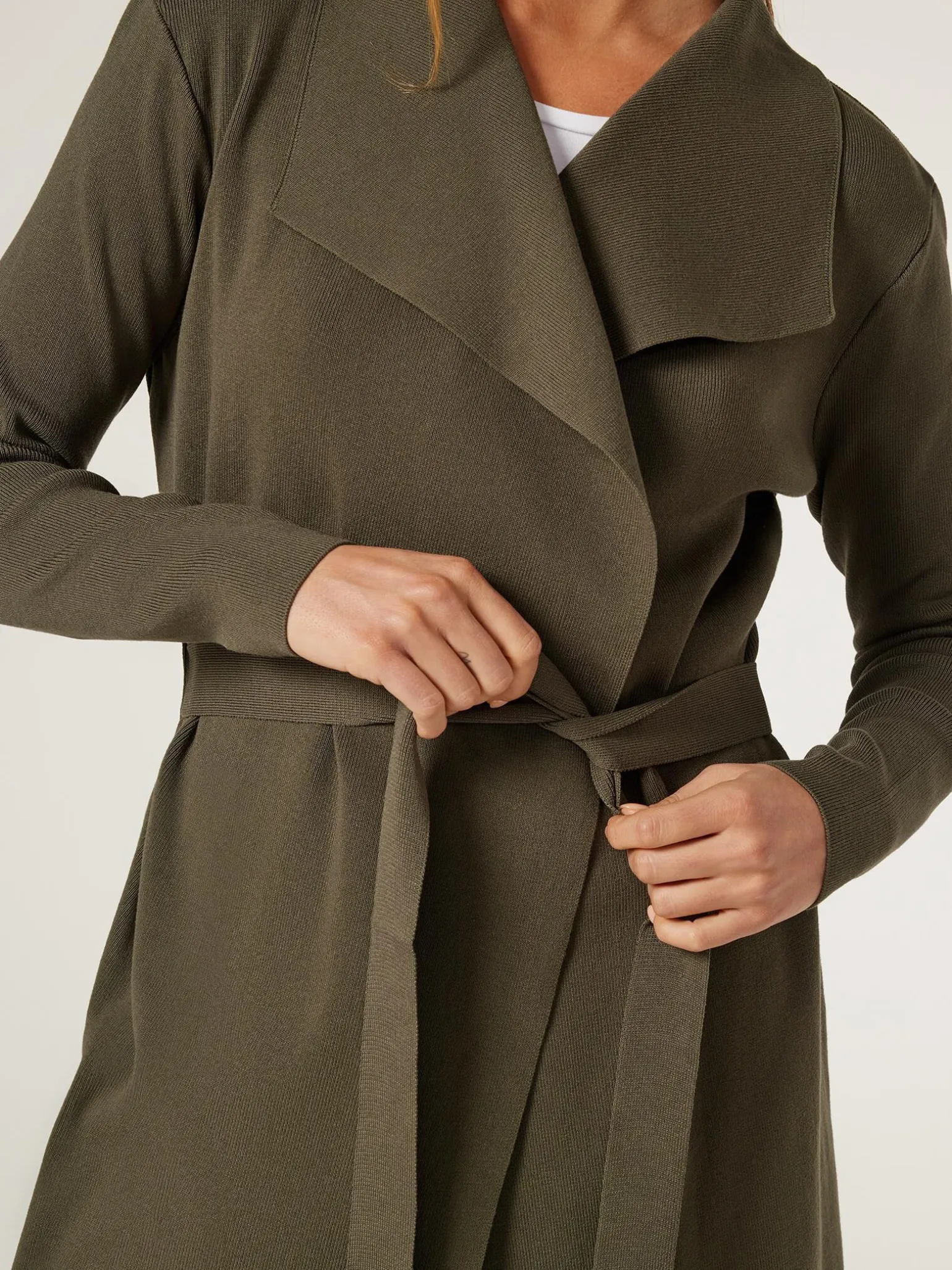 This longline cardigan is the ideal layering piece for cooler weather. Made from a soft viscose blend, this knit features an elegant waterfall collar and self tie waist. Wear it over jeans and a t-shirt for an understated and stylish winter look.