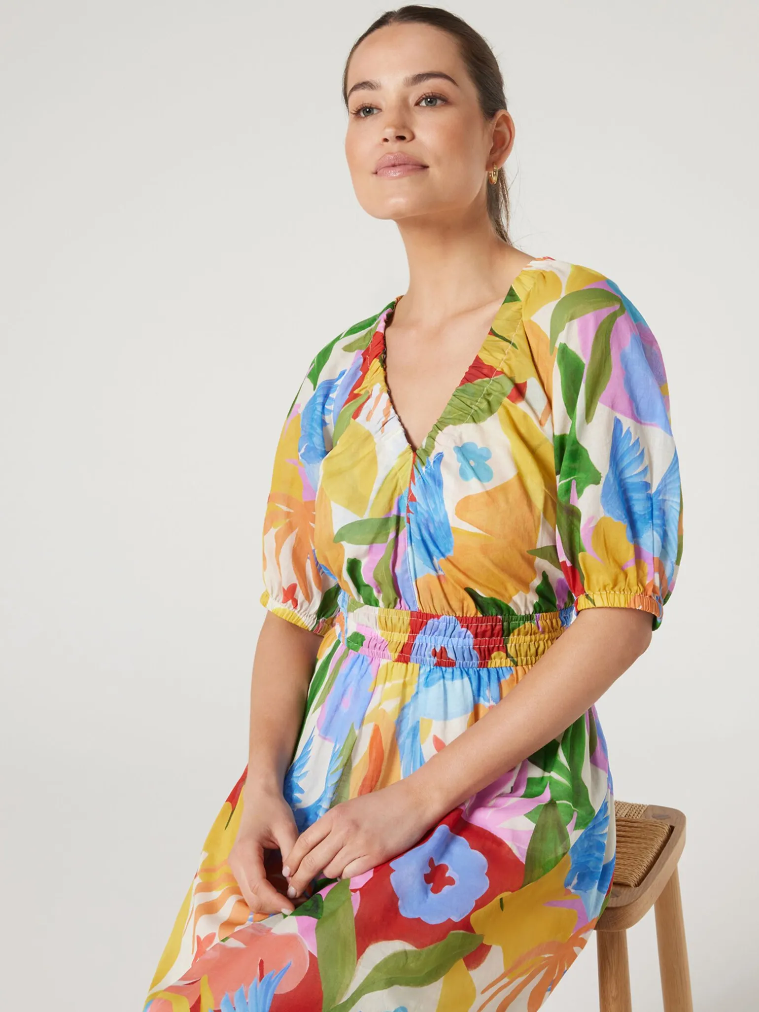 Feminine and flattering, this summer-inspired cotton maxi-dress merges comfort with style. With a panelled tier structure, raglan puff sleeve, v-neck and elasticated waist, this look can be worn to work or a wedding with ease.