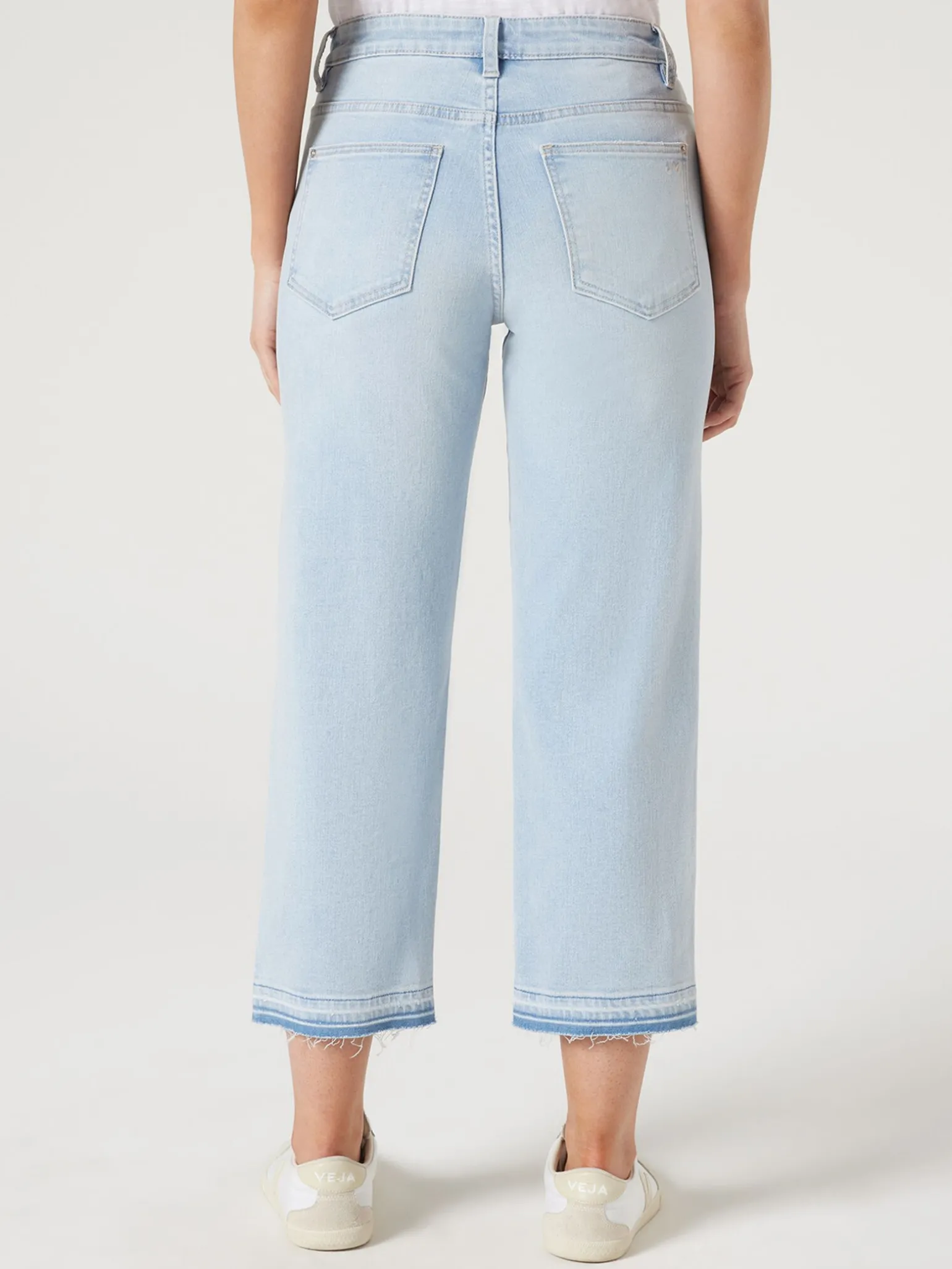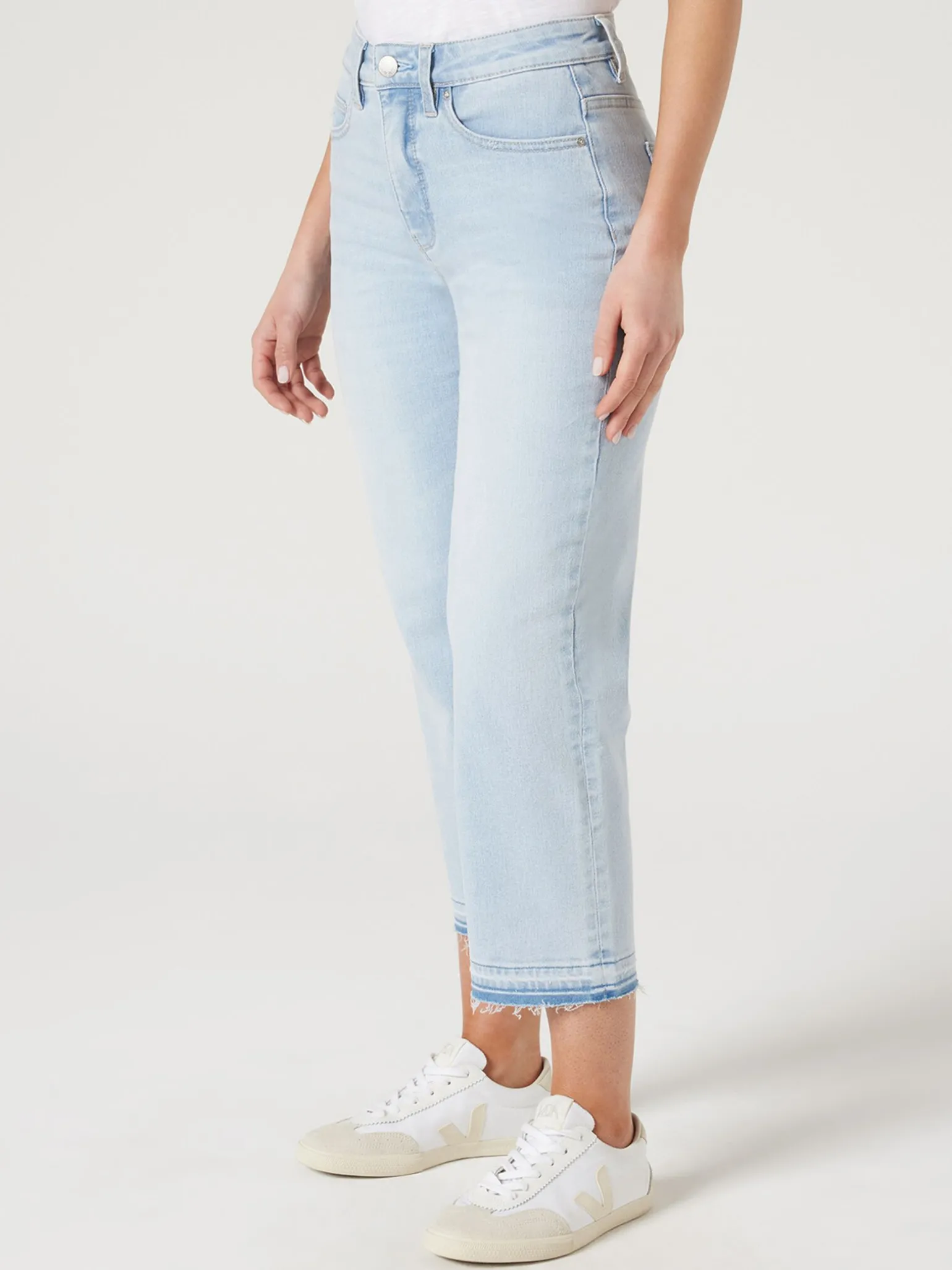 Cut to a straight leg structure with mid waist fit and distressed hem, these essential capri pants show off the ankle, and pair perfectly with strappy shoes. Features include classic five pocket styling and belt hoops