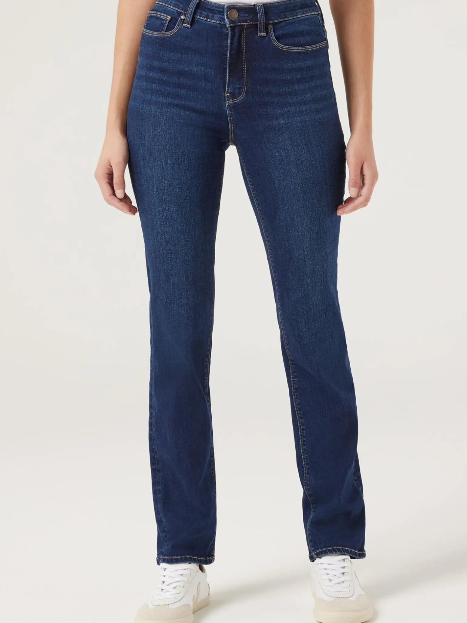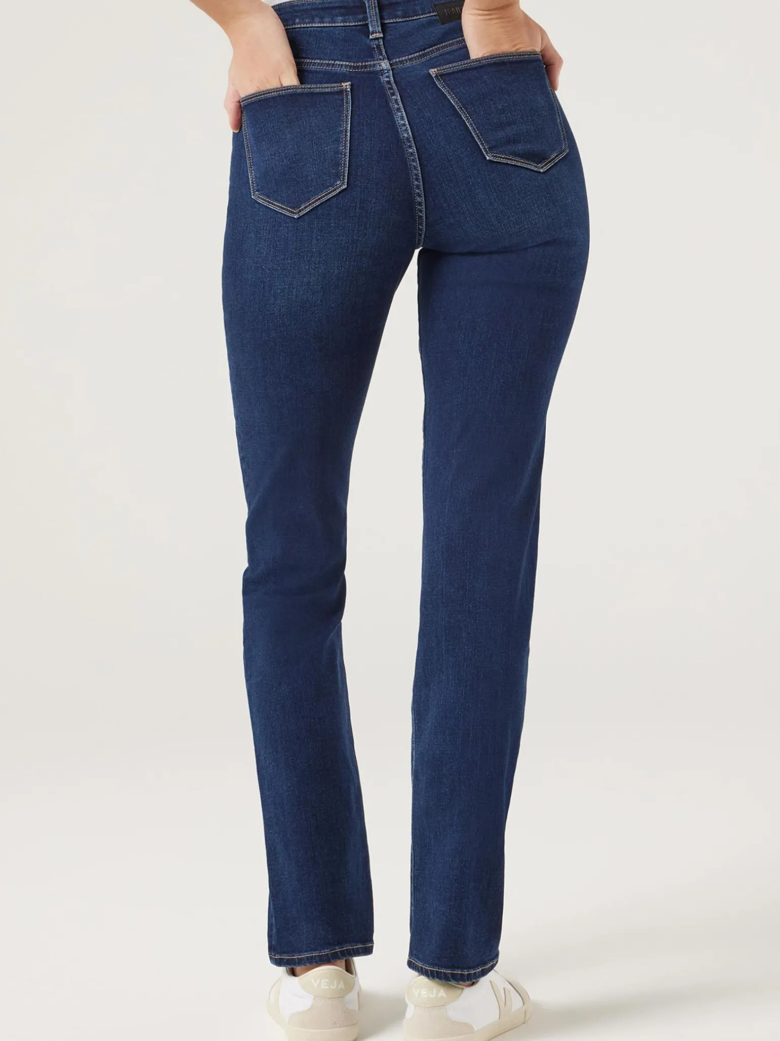 The Slim Straight Jeans are made from super soft, stretch denim that will move and flex with you all day. This jean is a classic fit that hugs the hips and thighs, with a straight leg from knee to hem. Features include five-pocket styling, custom branded hardware and a single button closure and zip fly.