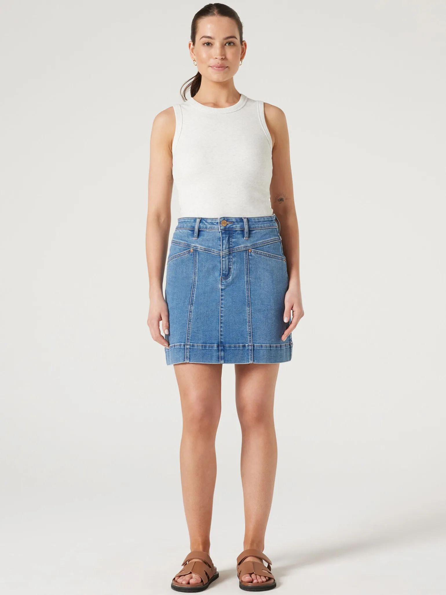 A nod to vintage denim skirts, this style features a mid-rise waist, side pockets, and front seam details. The look is complete with brass hardware, and double stitch detailing. Style it with you favourite casual tee for a weekend ready look.