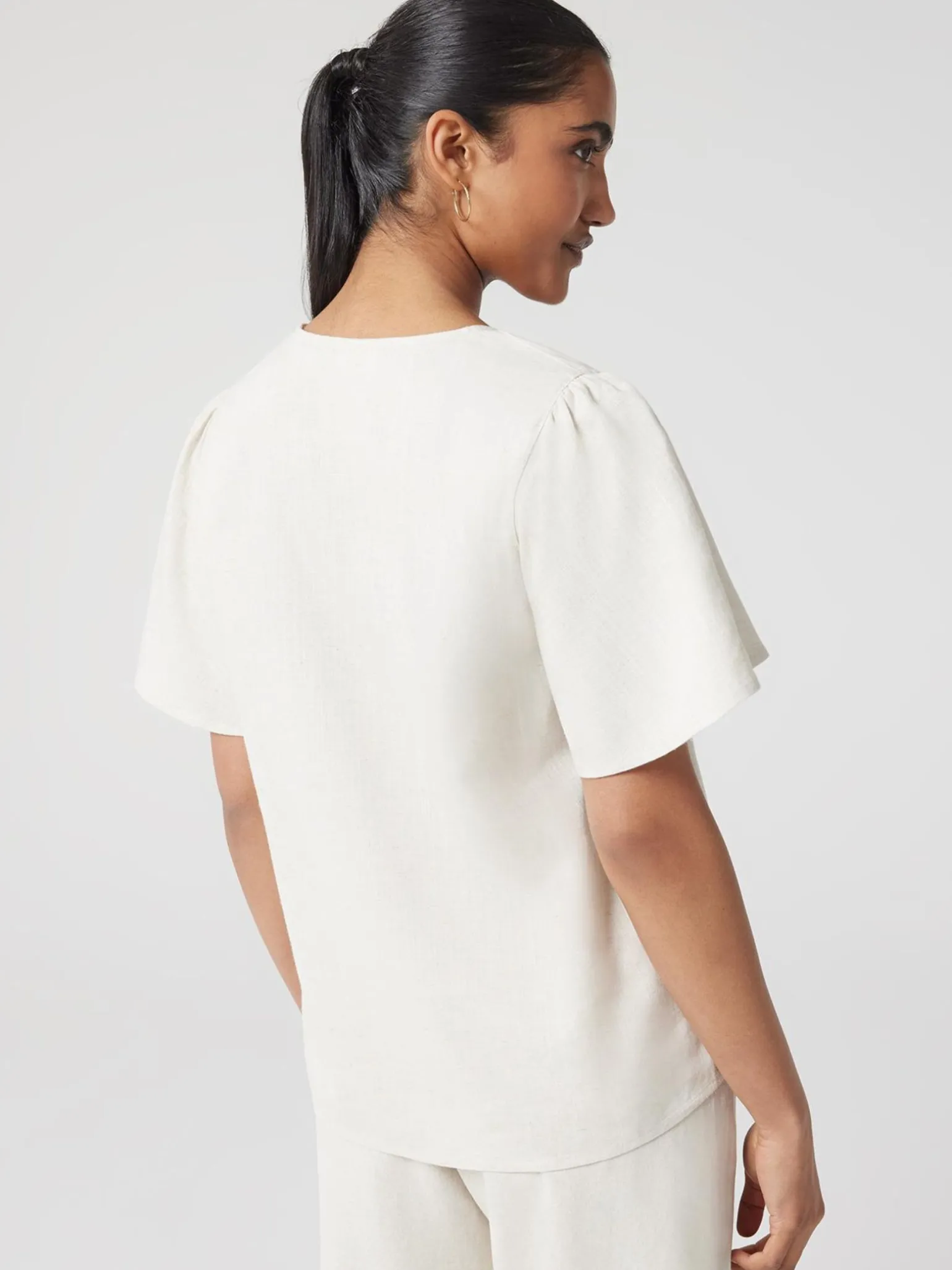 v-neckline, short flutter sleeve and relaxed fit, pair yours with linen pants or your go-to denim.