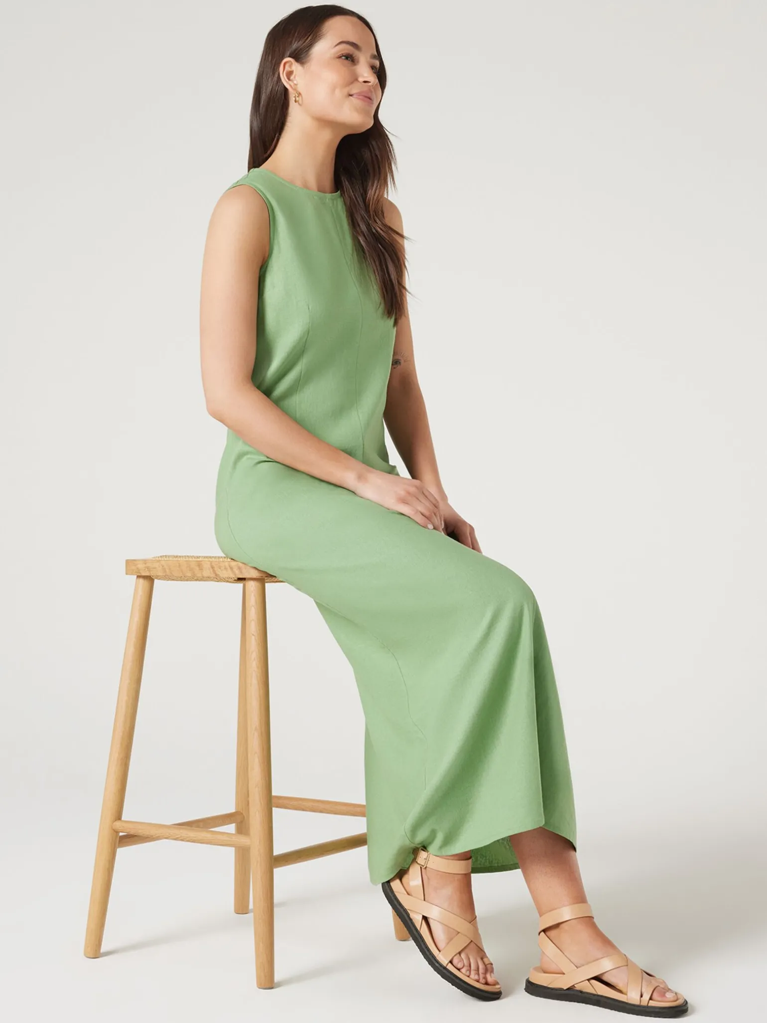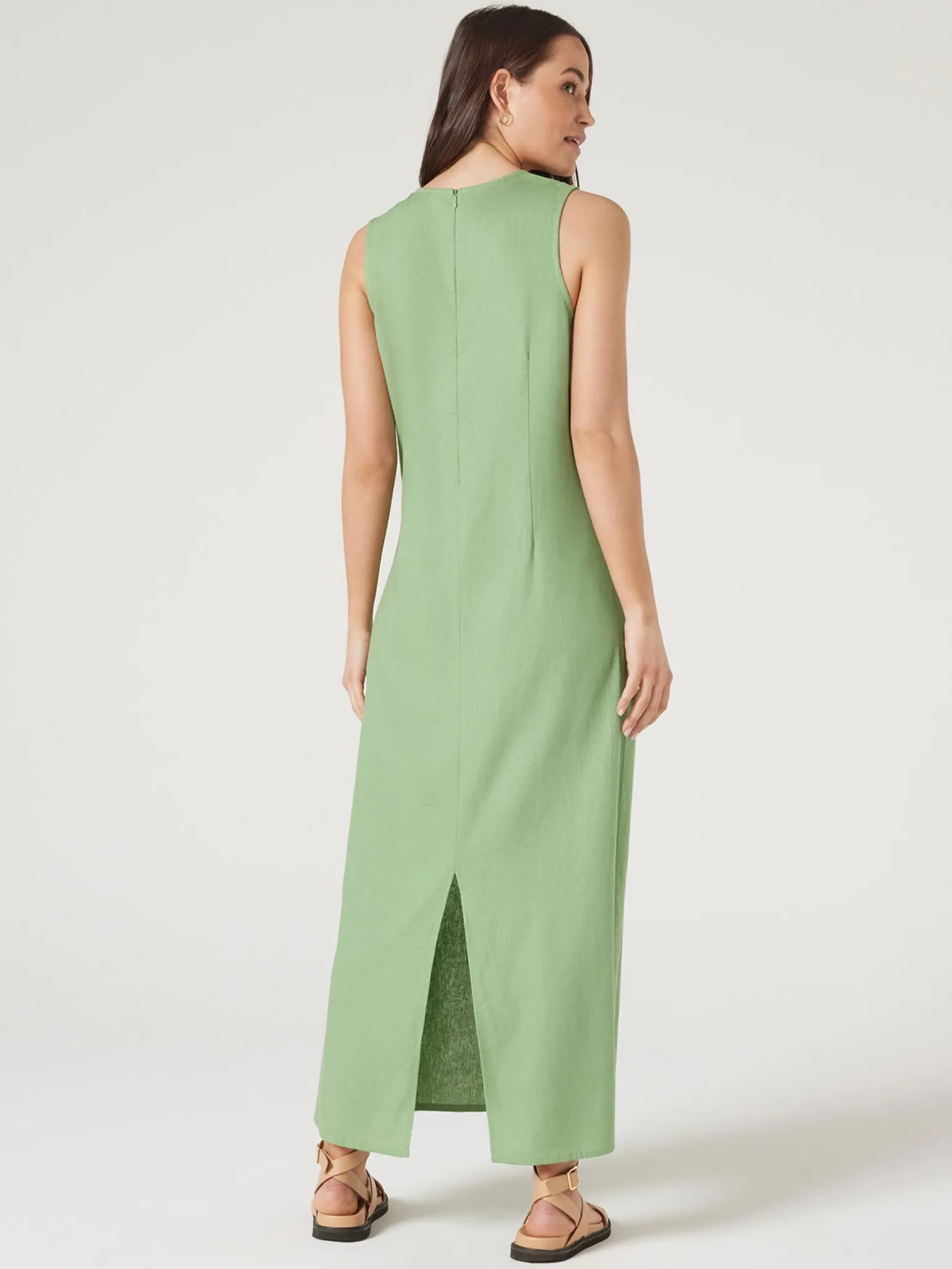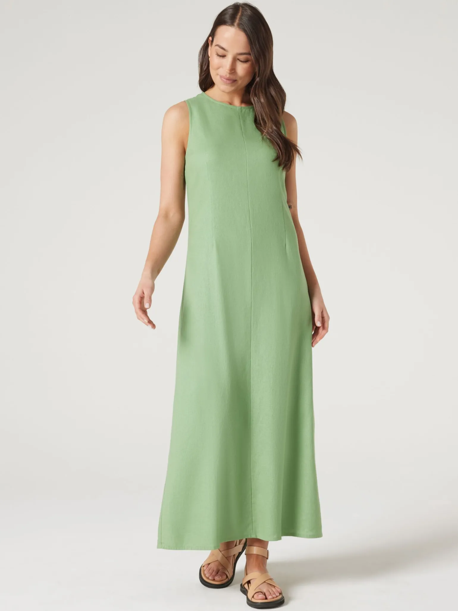 Clean, crisp and refined in structure, this classic linen maxi-dress is effortless and transeasonal. With tank sleeves and a high-cut crew neck, this relaxed dress merges comfort and style, and is versatile enough for work or play. Style it with a blazer or on its own any time of year.