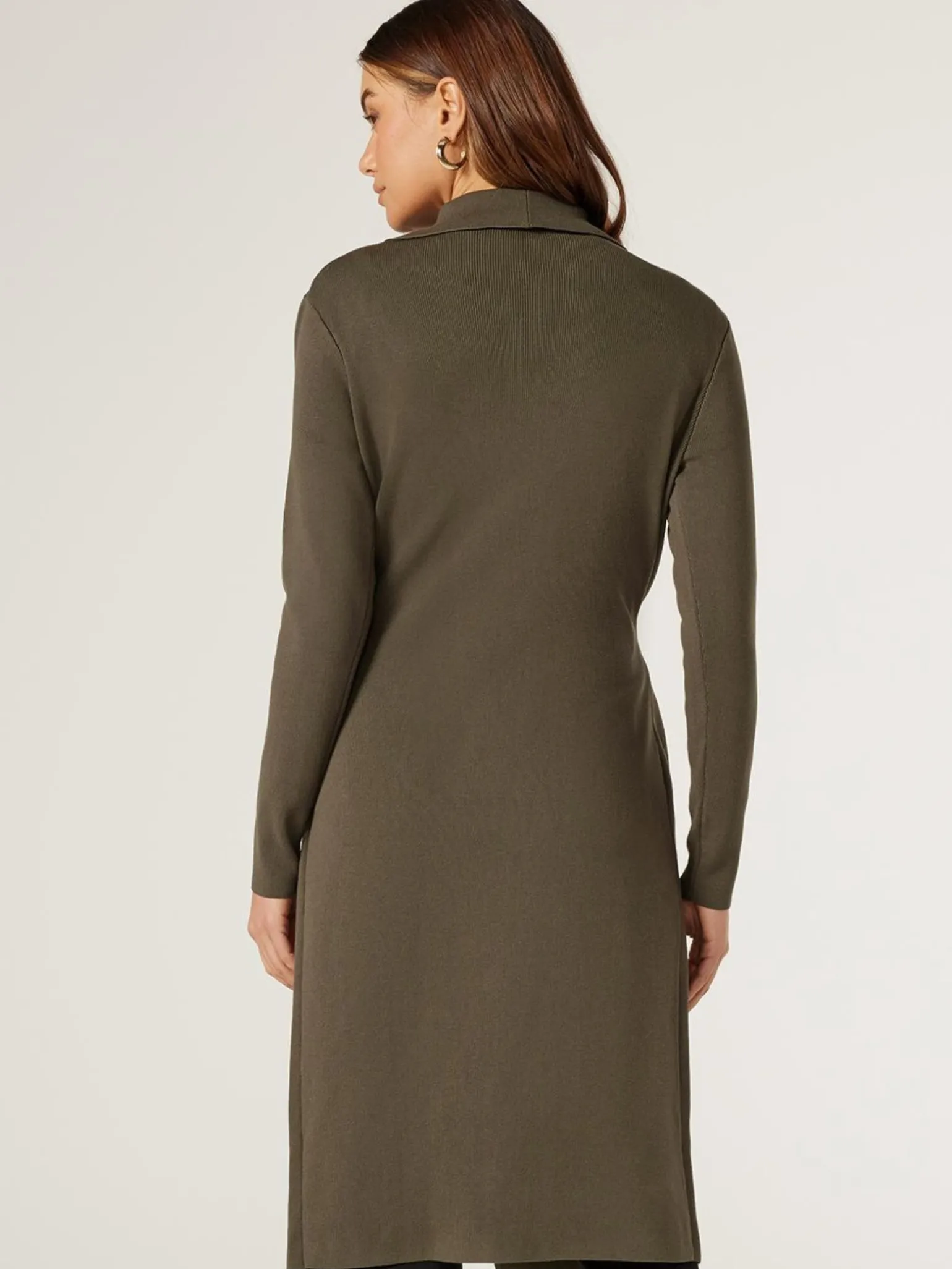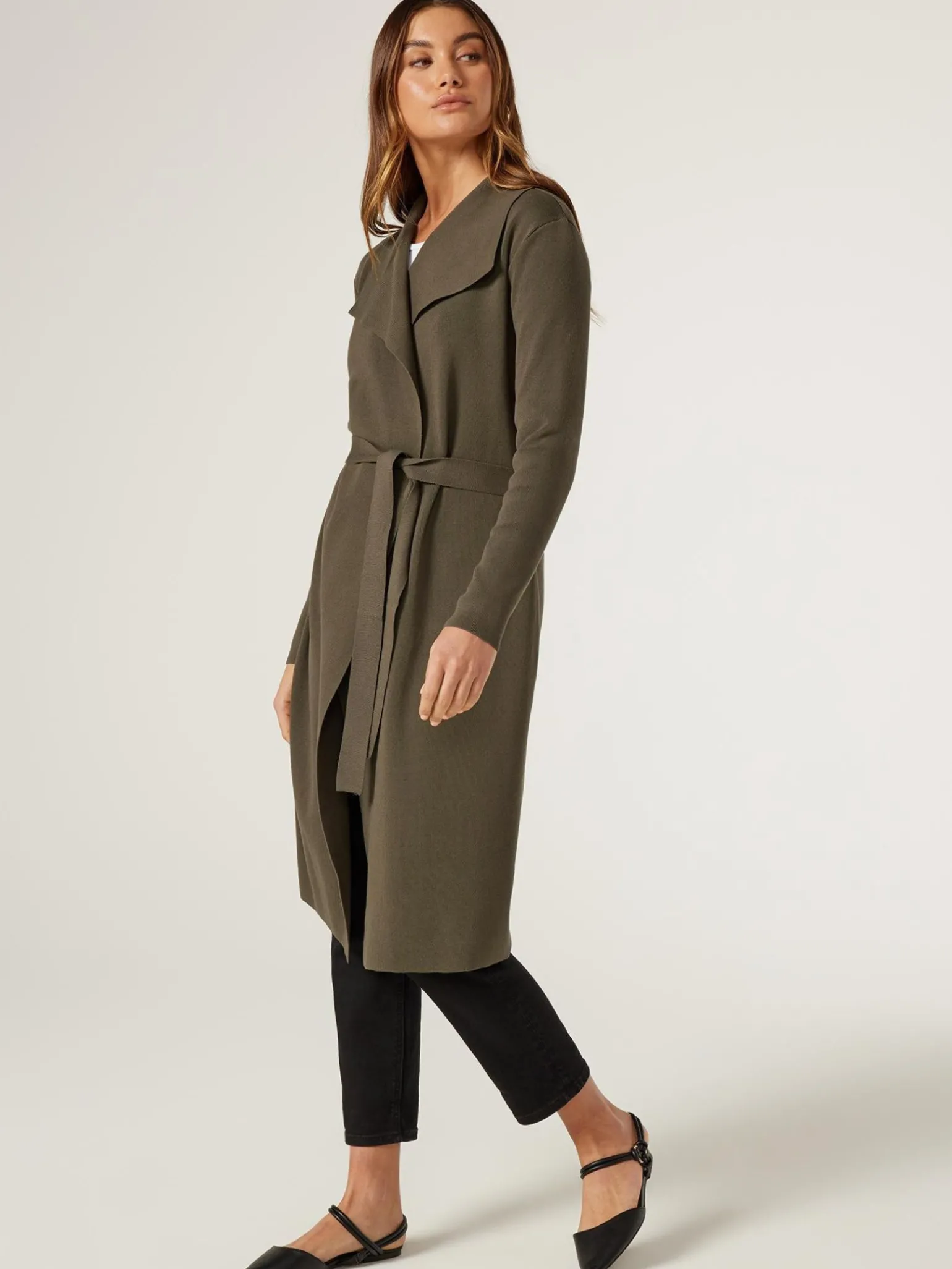 This longline cardigan is the ideal layering piece for cooler weather. Made from a soft viscose blend, this knit features an elegant waterfall collar and self tie waist. Wear it over jeans and a t-shirt for an understated and stylish winter look.
