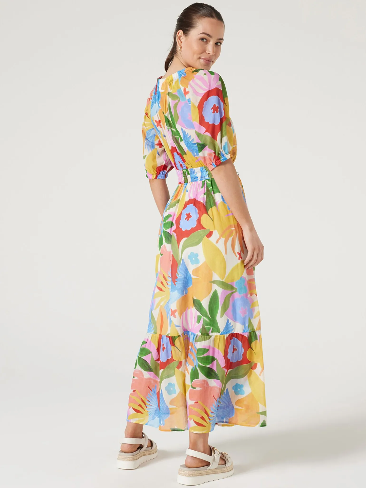 Feminine and flattering, this summer-inspired cotton maxi-dress merges comfort with style. With a panelled tier structure, raglan puff sleeve, v-neck and elasticated waist, this look can be worn to work or a wedding with ease.