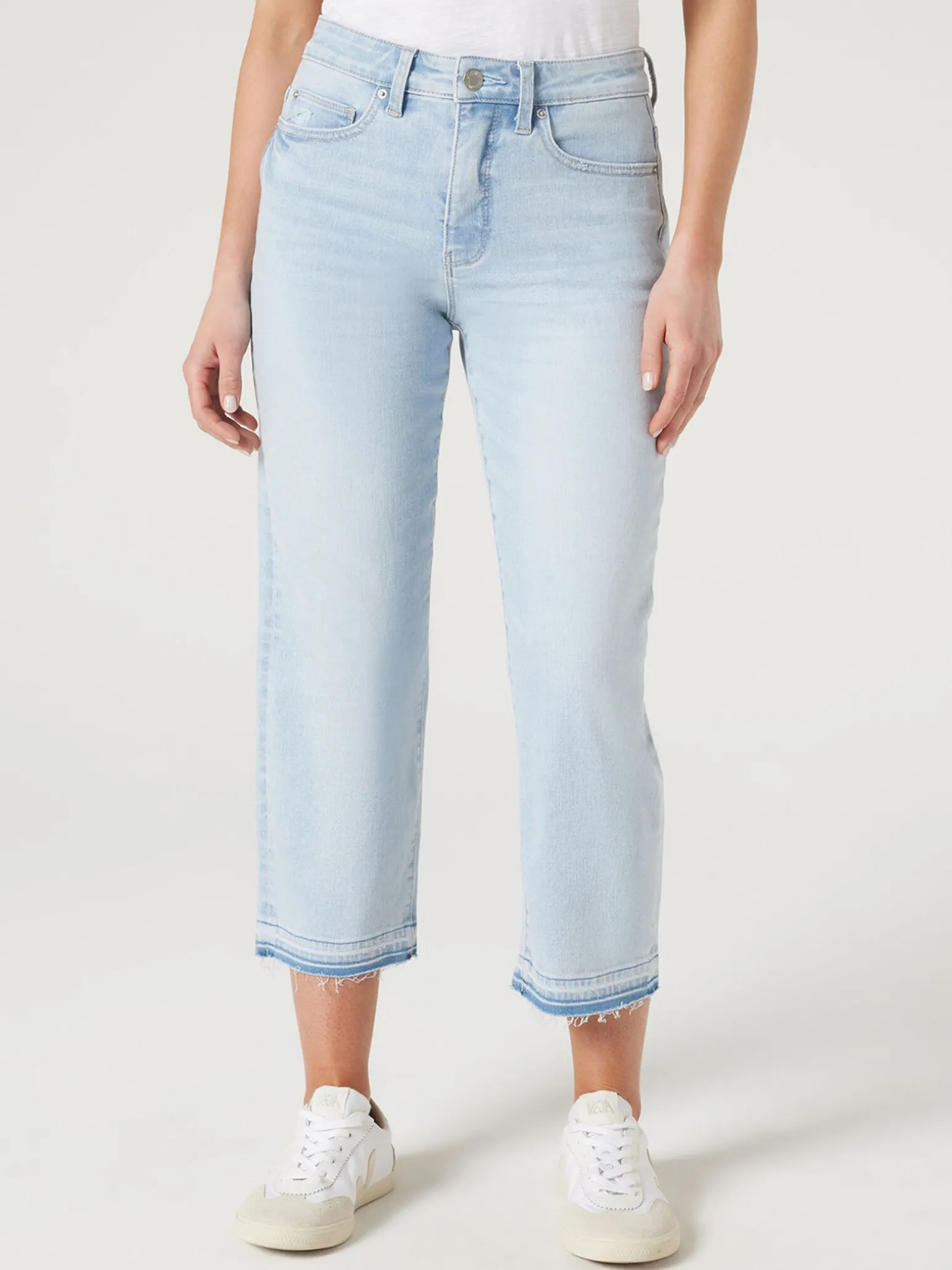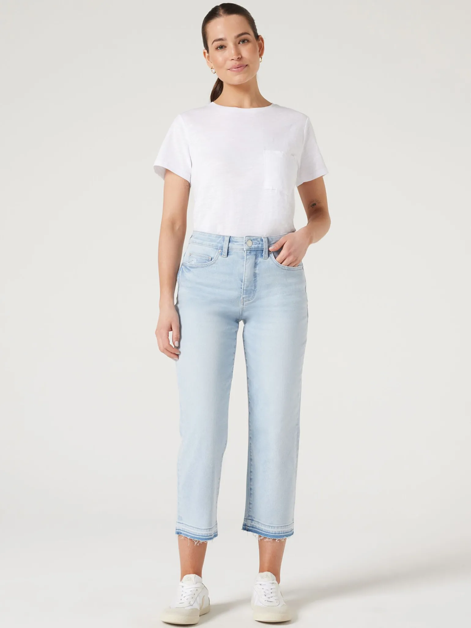 Cut to a straight leg structure with mid waist fit and distressed hem, these essential capri pants show off the ankle, and pair perfectly with strappy shoes. Features include classic five pocket styling and belt hoops