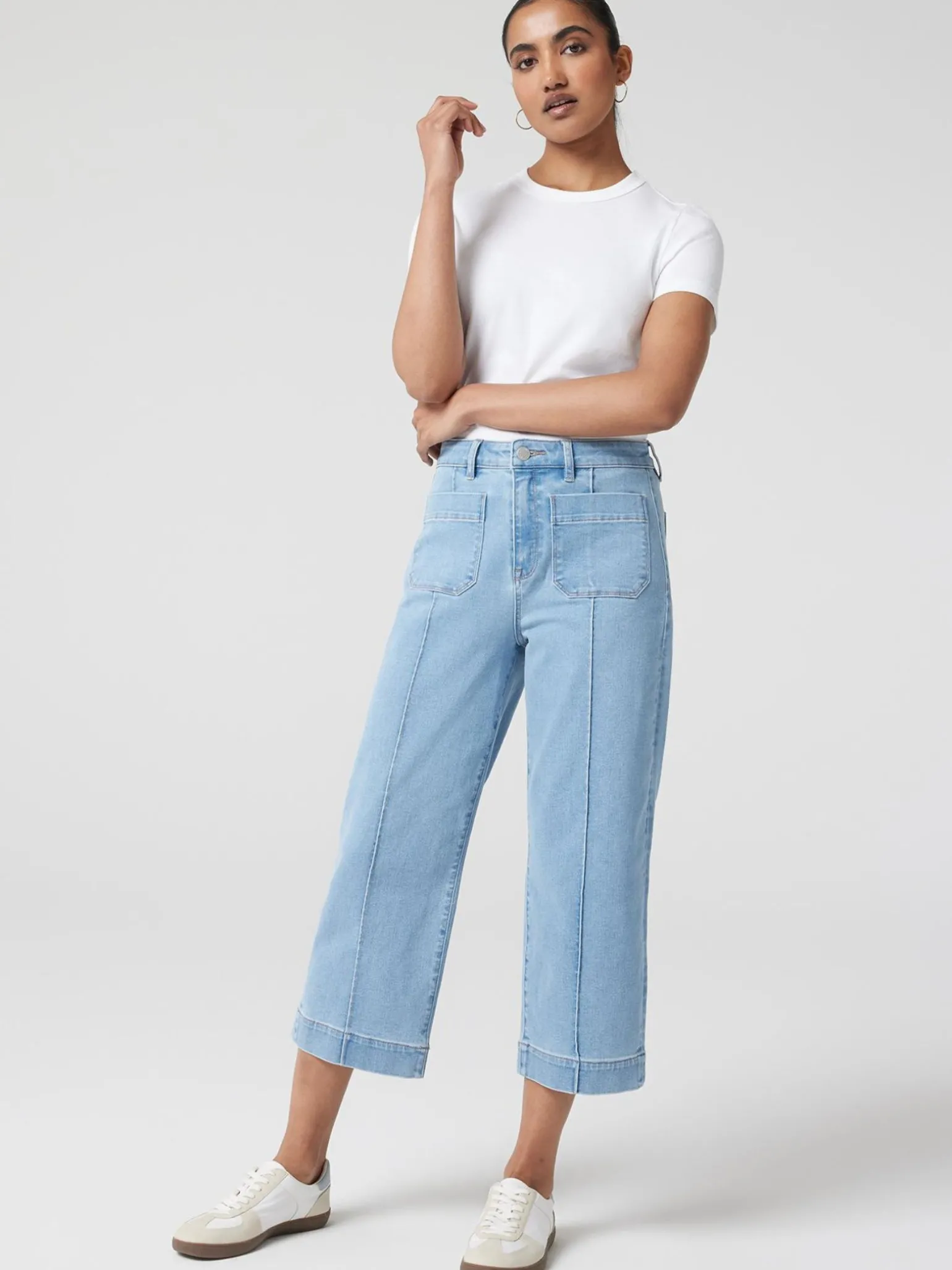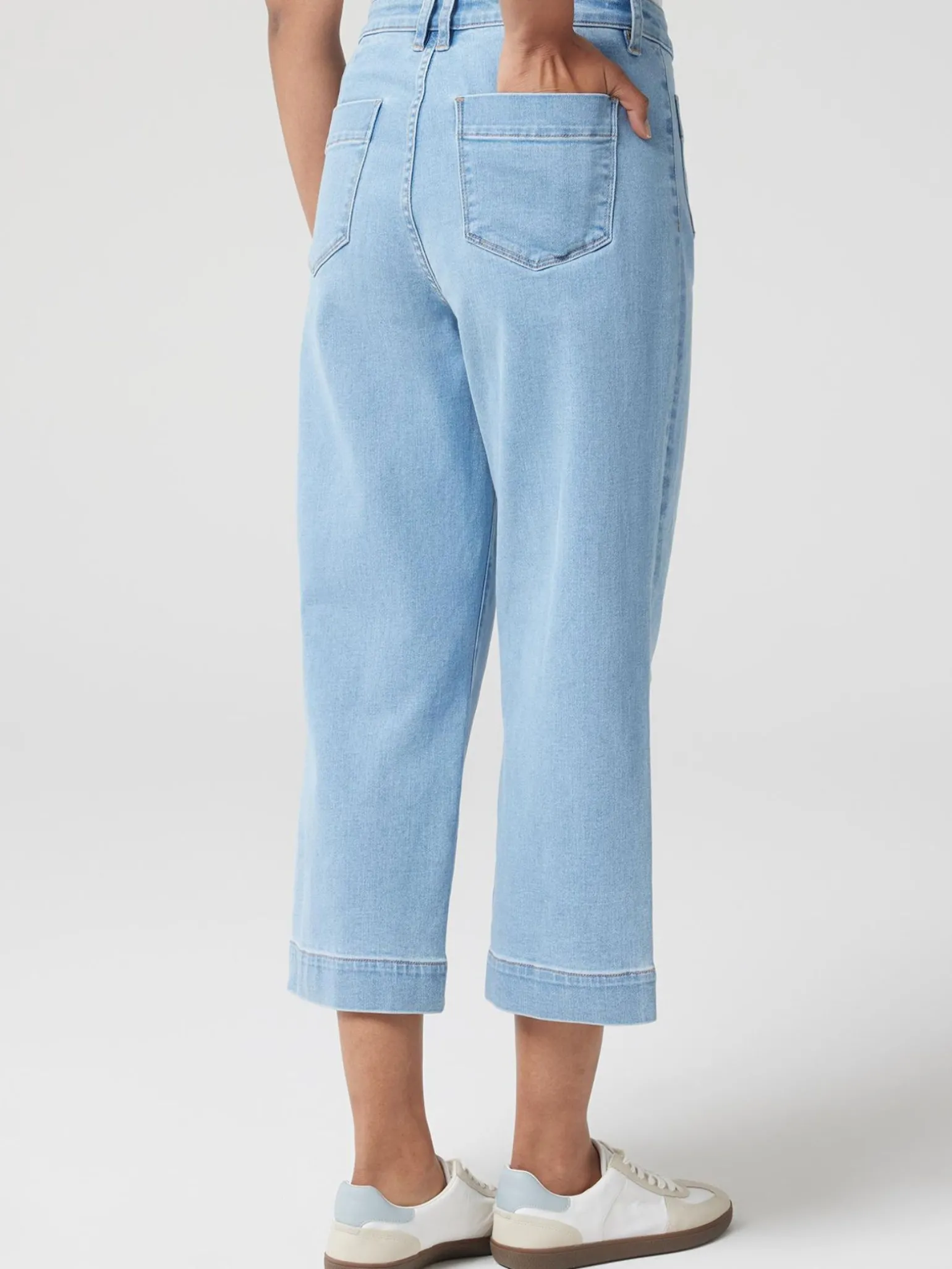 These high-waisted, cropped capri jeans feature a wide, loose leg profile with classic sailor detailing, engraved hardware, patch pockets at front and regular pockets at the back. Crafted from a comfort stretch fabrication let them take you wherever you want to go. Wear yours with a classic white t-shirt for easy, sunny days.