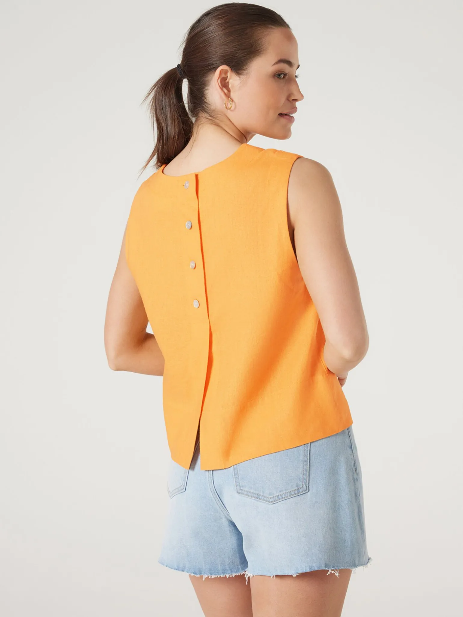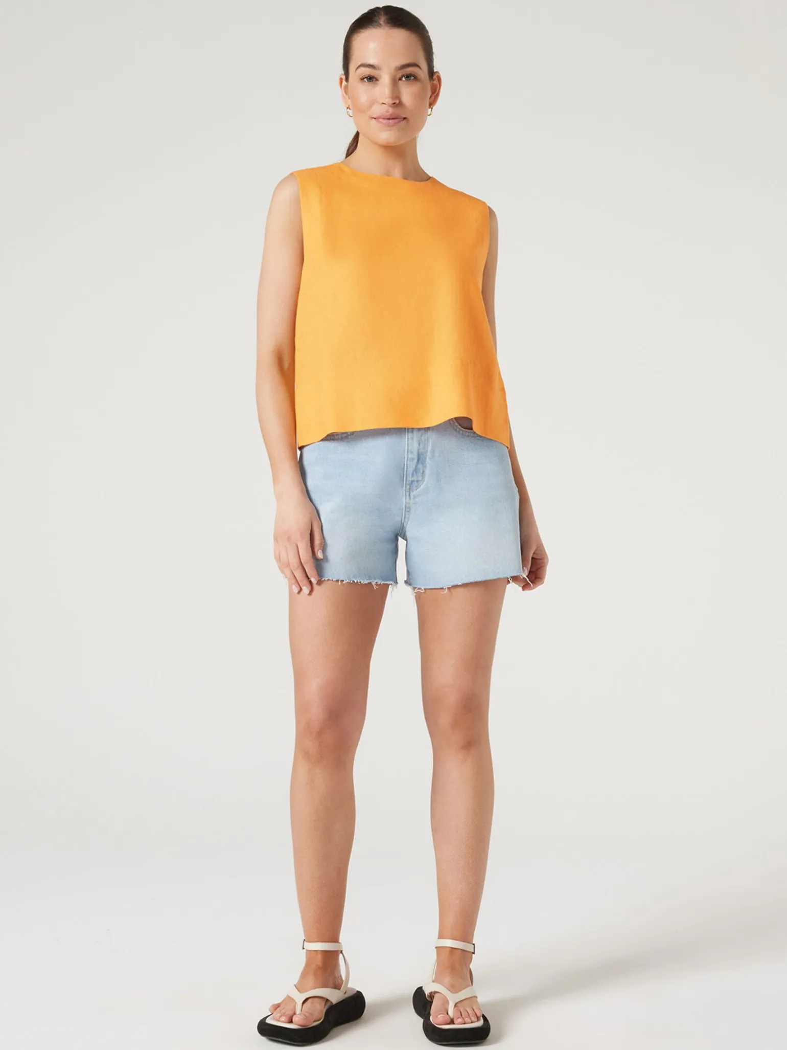 This flattering linen tank is the perfect basic to dress up or down for versatile outfit options. With a boxy, cropped, sleeveless structure, and crew-neck, this style pairs perfectly with high waisted denim or linen trousers.