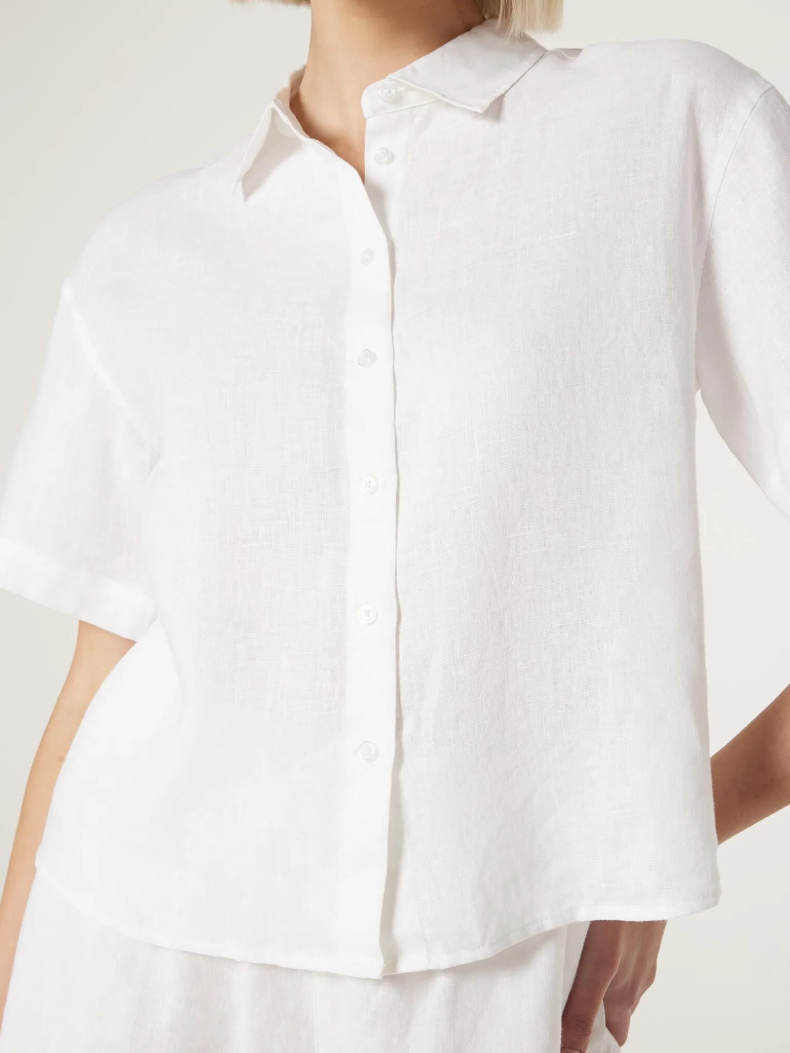 A classic style crafted from pure linen, this short sleeved shirt pairs perfectly with jeans any time of year. With a slightly cropped body and button through front, the structure is relaxed for all day comfort.