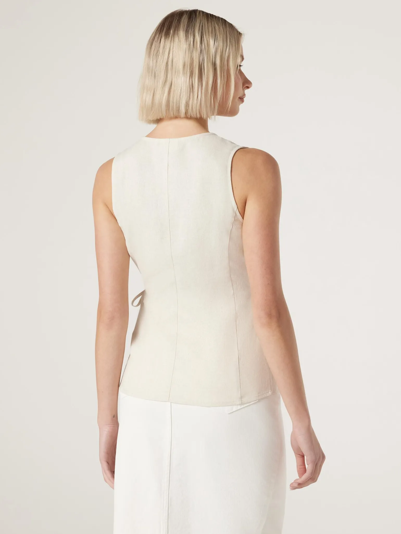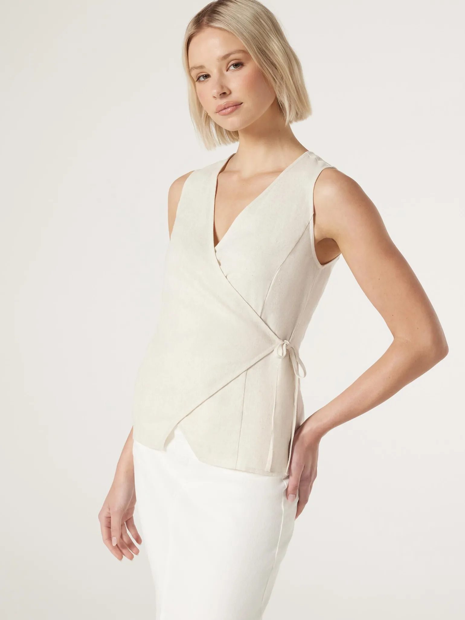 Made from a soft linen fabric, this classic wrap top is clean and crisp with a refined structure. Featuring a wrap front with side tie, and a v-neckline, this top can be paired with tailored pants for a work-ready look, or denim on the weekends.
