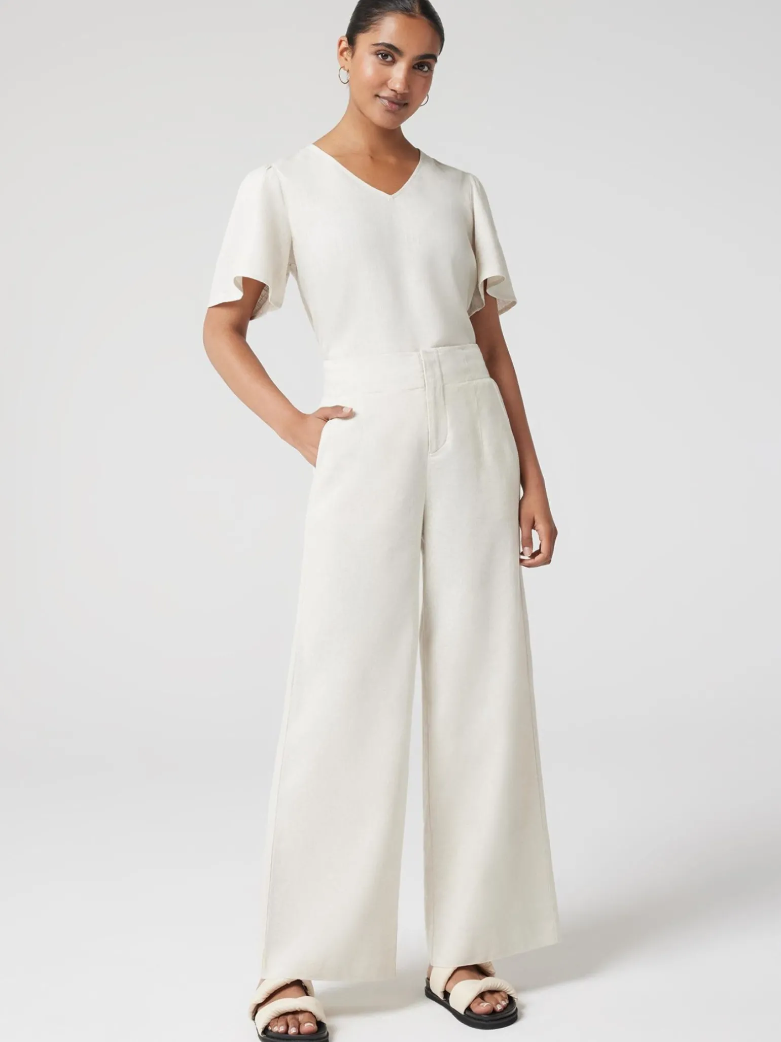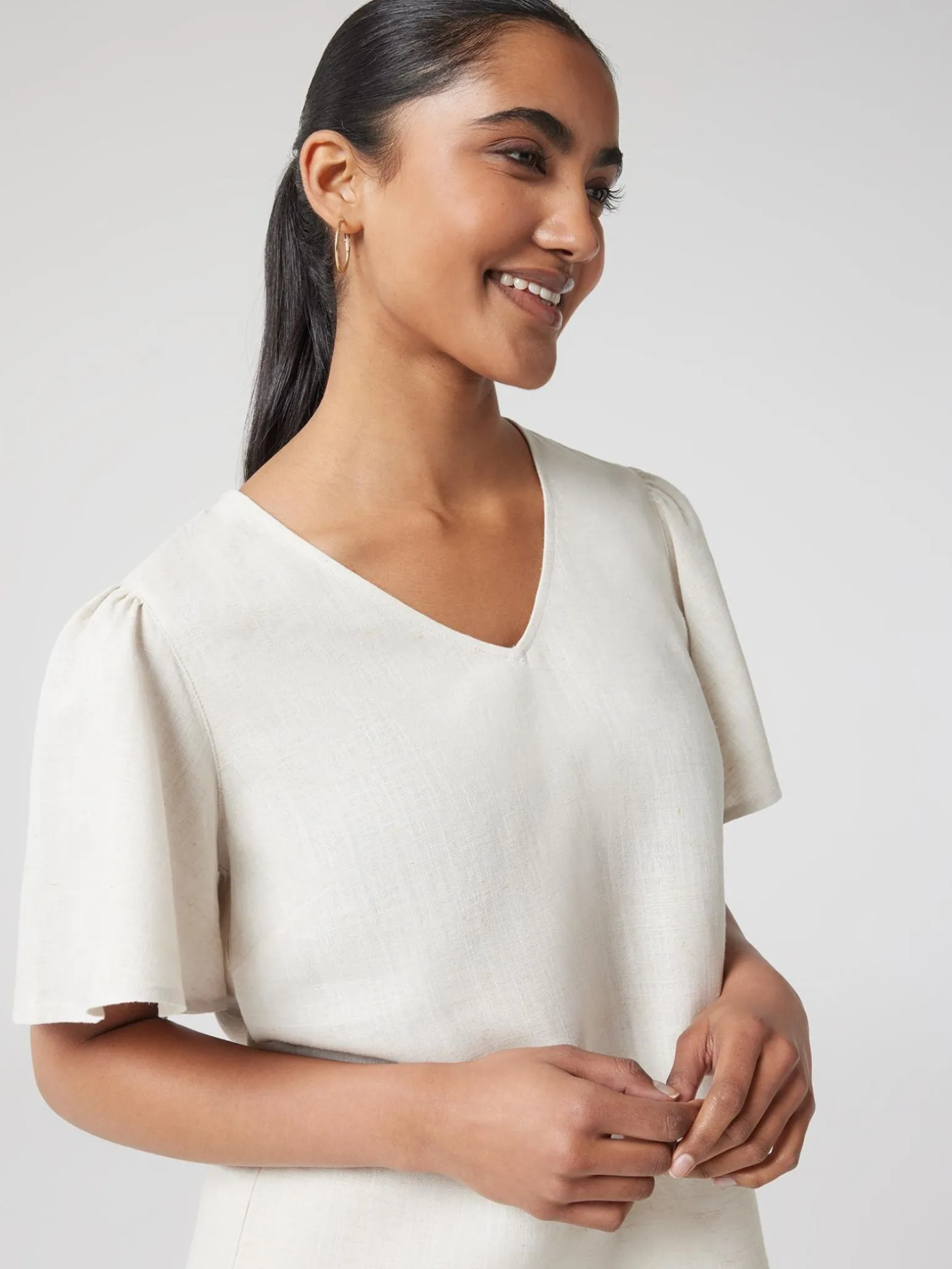 v-neckline, short flutter sleeve and relaxed fit, pair yours with linen pants or your go-to denim.
