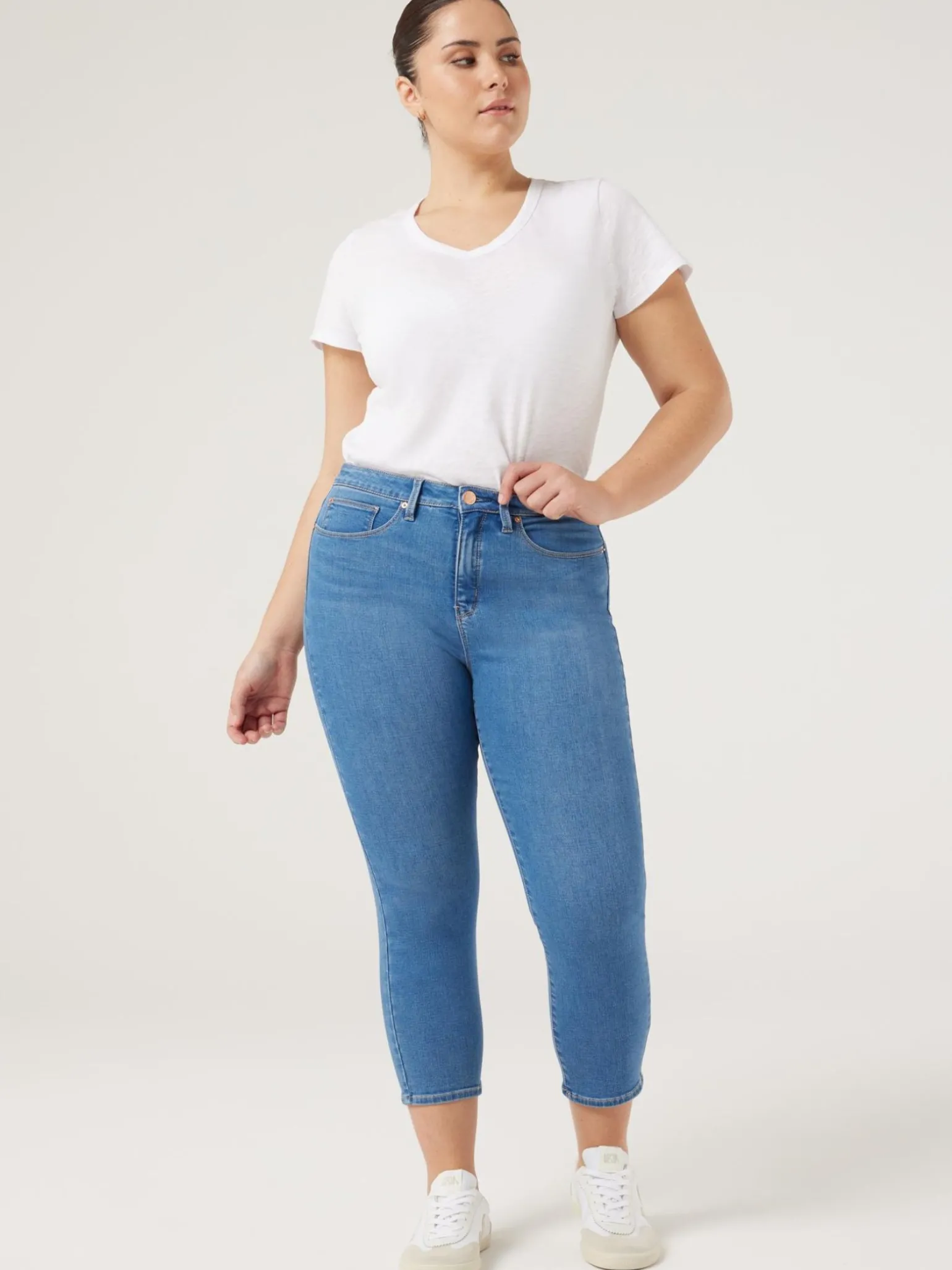 The Kara Curve Skinny Capri has been designed and engineered to fit the waist and hug the curves of the hips and thighs to create the perfect fit. Crafted from a stretch denim for movement and comfort, these skinny fit capri pants sit on a mid-waist rise with snug fit on the waist and leg. Perfect to pair with sneakers and a casual tee, the look is complete with belt hoops and a button fly closure.